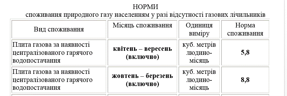 Указанные цифры касаются квартир, в которых не установлены счетчики на газ. Так, действующую норму (3,3 куба на человека) заменят таким образом, что зависимо от месяца сумма в платежках будет меняться. При наличии горячего водоснабжения с апреля по сентябрь норма составит 5,8 куб. м, с октября по март — 8,8 куб. м.