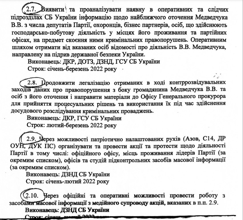 В 2.9 опубликованного в СМИ документа СБУ поручается посредством подконтрольных службе «патриотически настроенных движений (Азов, С14, ОУН, ДУК ПС) организовать и провести акции и протесты против деятельности партии». В частности, есть задача пикетировать офис партии, места жительства членом партии, офисов и студий подконтрольных средств массовой информации.