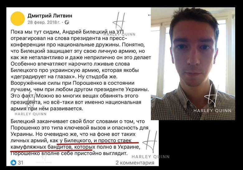 Також у своїх дописах Литвин публікував образи на адресу Збройних Сил України, називаючи їх "стайками камуфляжних бандитів".