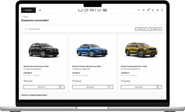 Юдрайв пропонує детальну систему порівняння моделей — користувач бачить усі технічні характеристики, комплектації та ціни в єдиному форматі. Це особливо зручно, адже інформація про різні бренди зазвичай розміщена на сайтах дилерів у різних форматах.
