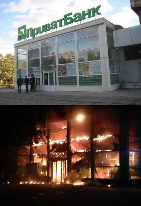 Этой ночью в Мариуполе полностью сгорело отделение ПриватБанка, которое располагается рядом с ОГА. Об этом сообщают социальные сети, сайт 0629.com.ua и некоторые российские СМИ.