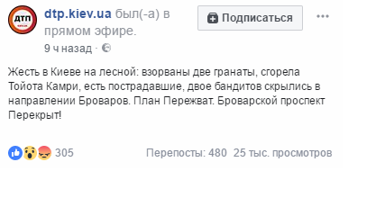 «Жесть в Киеве на лесной: взорваны две гранаты, сгорела Тойота Камри, есть пострадавшие, двое бандитов скрылись в направлении Броваров», — сказано в сообщении.