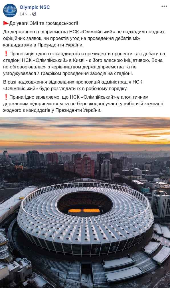 В свою очередь, пресс-служба государственного предприятия НСК «Олимпийский» на своей странице в Facebook сообщила, что готова рассмотреть возможность проведения встречи двух кандидатов на своей площадке, однако на данный момент никаких официальных заявок на этот счет к ним не поступало.